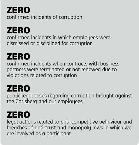Building on this understanding, we will strive to safeguard our workforce and Carlsberg’s operations in their entirety by applying a strict zero-tolerance policy on bribery and corruption. We will reinforce clear expectations, strengthen internal oversight and ensure that every level of the organisation understands its responsibility to uphold these standards in our daily business conduct.