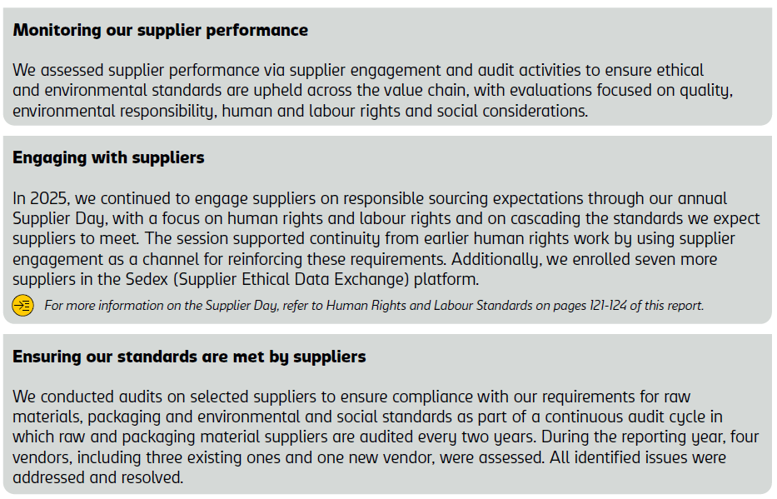 Our approach is also aligned with our Supplier and Licensee Code of Conduct and Procurement - Purchasing and Buying Policy, which were refreshed in 2025. The Code defines the requirements for all suppliers and licensees, encompassing labour and human rights, health and safety, environmental sustainability, business ethics, competition and fair trade and data protection.