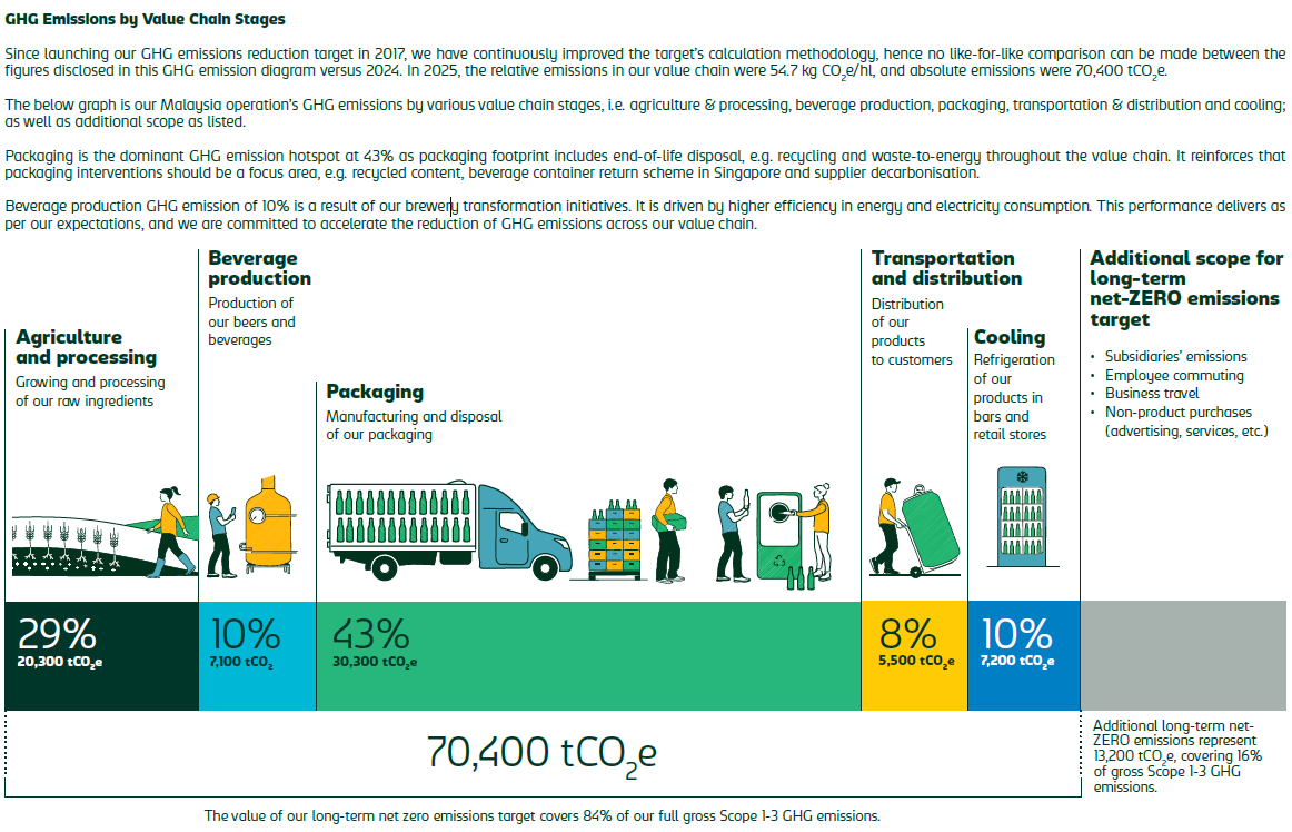 Value Chain: Contributing to Malaysia’s low-carbon transition by working with our suppliers, logistics partners and customers to reduce value chain emissions, improve climate risk management and embed sustainability considerations into how our products are brewed, packaged, transported and consumed.