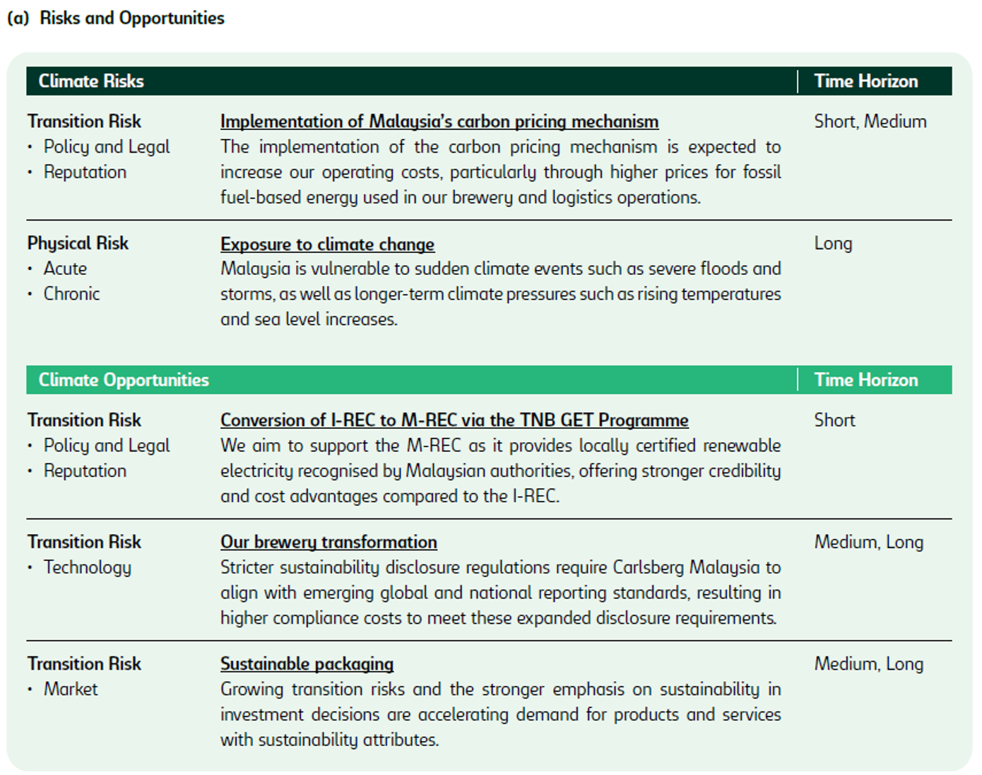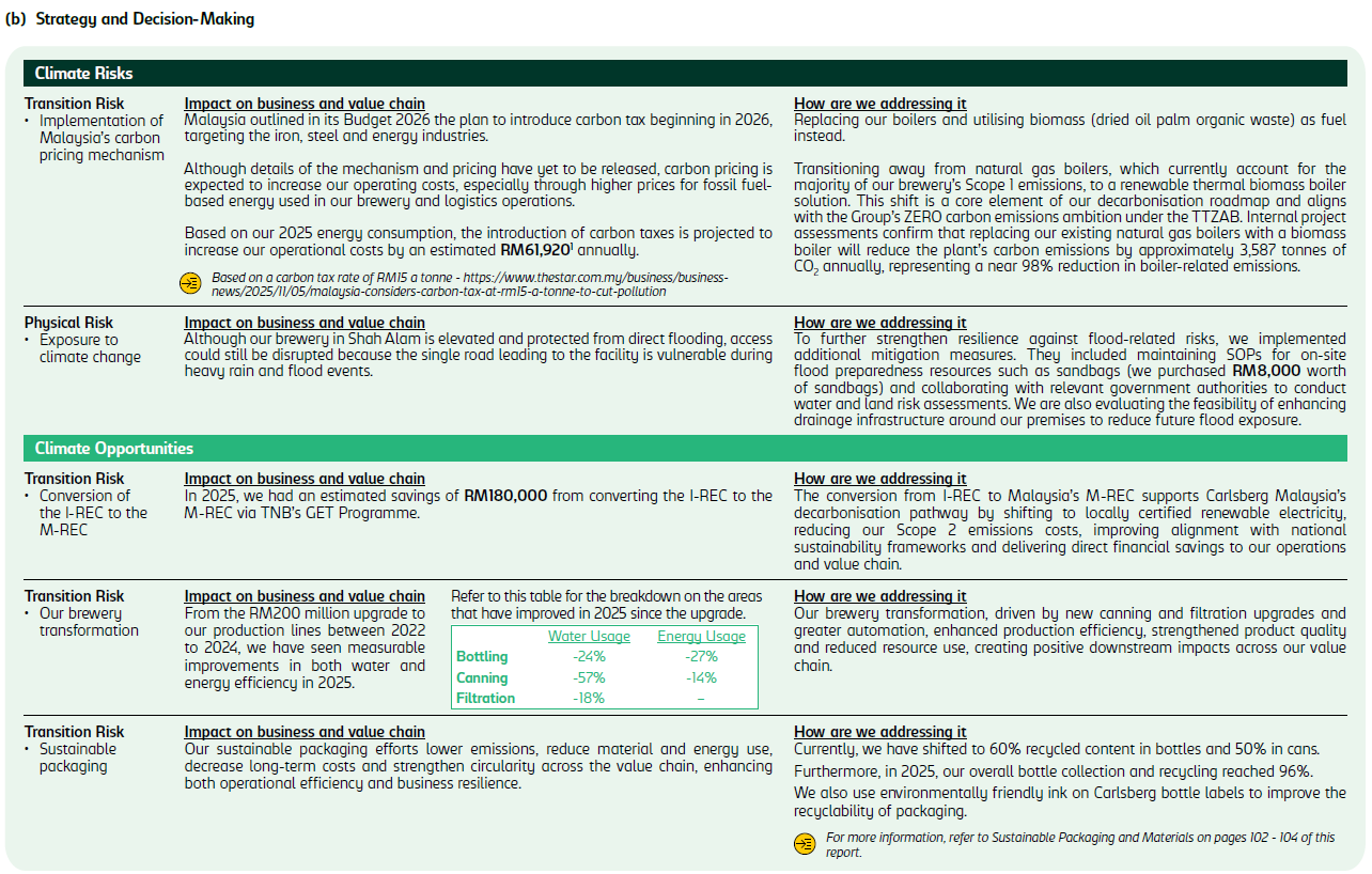 For more information on our climate-related risks and opportunities and climate scenario analysis, refer to Our Journey Towards Net Zero on pages 91 to 106 in Carlsberg Malaysia Group’s IAR 2024.