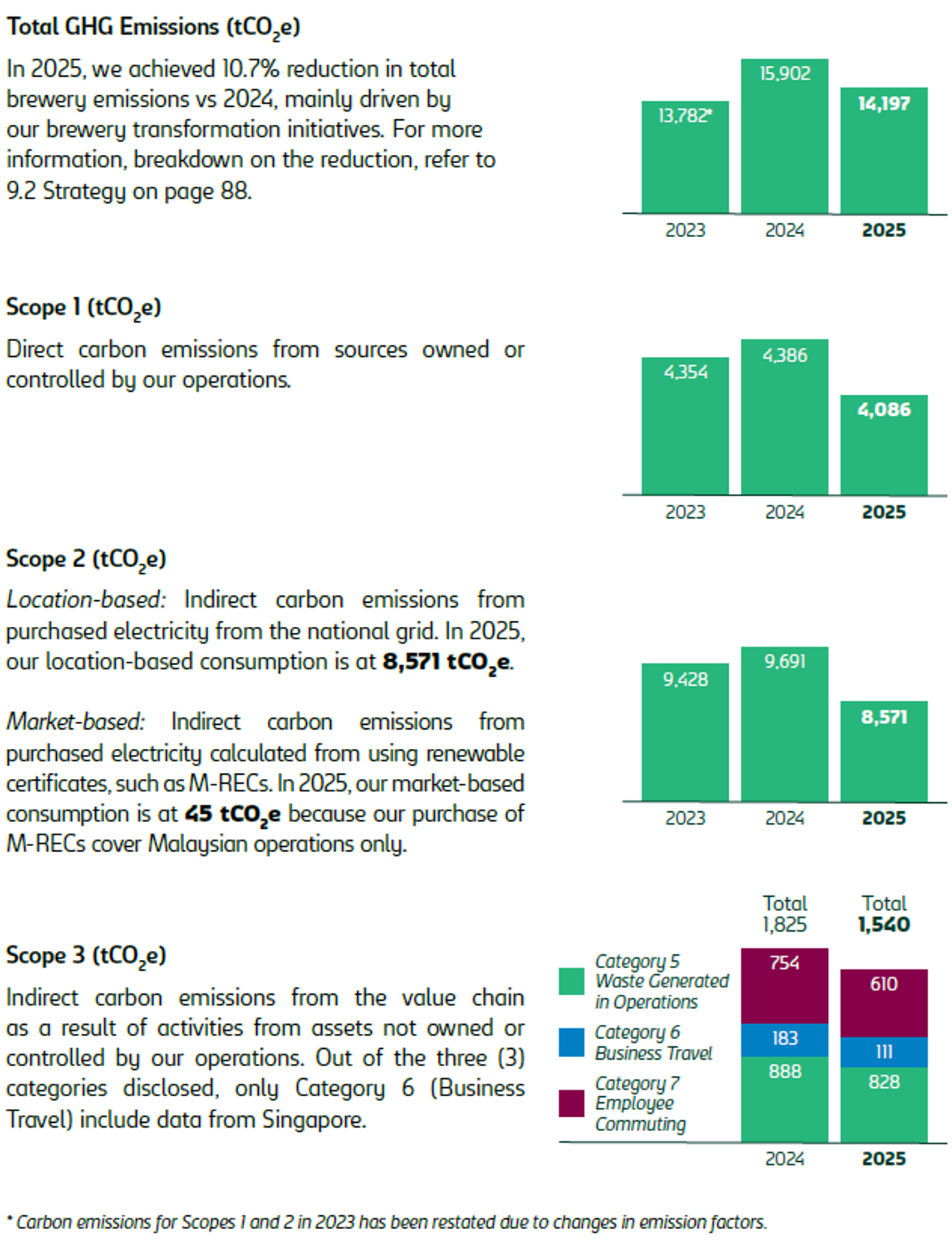 Our medium-term value chain 2030 target covers all Scopes 1 and 2 emissions, as illustrated under ‘Beverage Production’ on page 91. It is aligned with a 1.5°C pathway, using the assumptions and criteria from the SBTi. In 2025, we enhanced our disclosures with Scope 2 (tCO2e) market-based while maintaining the disclosure of three categories of Scope 3 carbon emissions, namely Category 5 (Waste Generated in Operations), Category 6 (Business Travel) and Category 7 (Employee Commuting) for both our operations in Malaysia and Singapore.