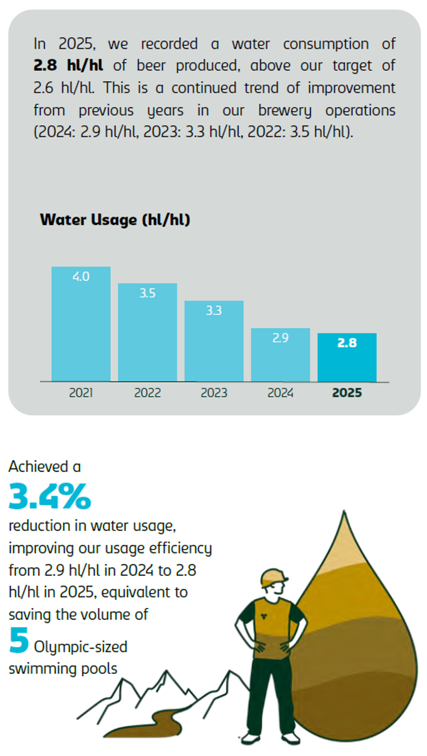 Our commitment to brewing excellence is driven by efficient water management, measured through our Key Performance Indicator (KPI) of water usage per hectolitre (hl) of beer produced. As water is a shared resource, its availability is critical not only for our operational success but also for the health of the surrounding community.