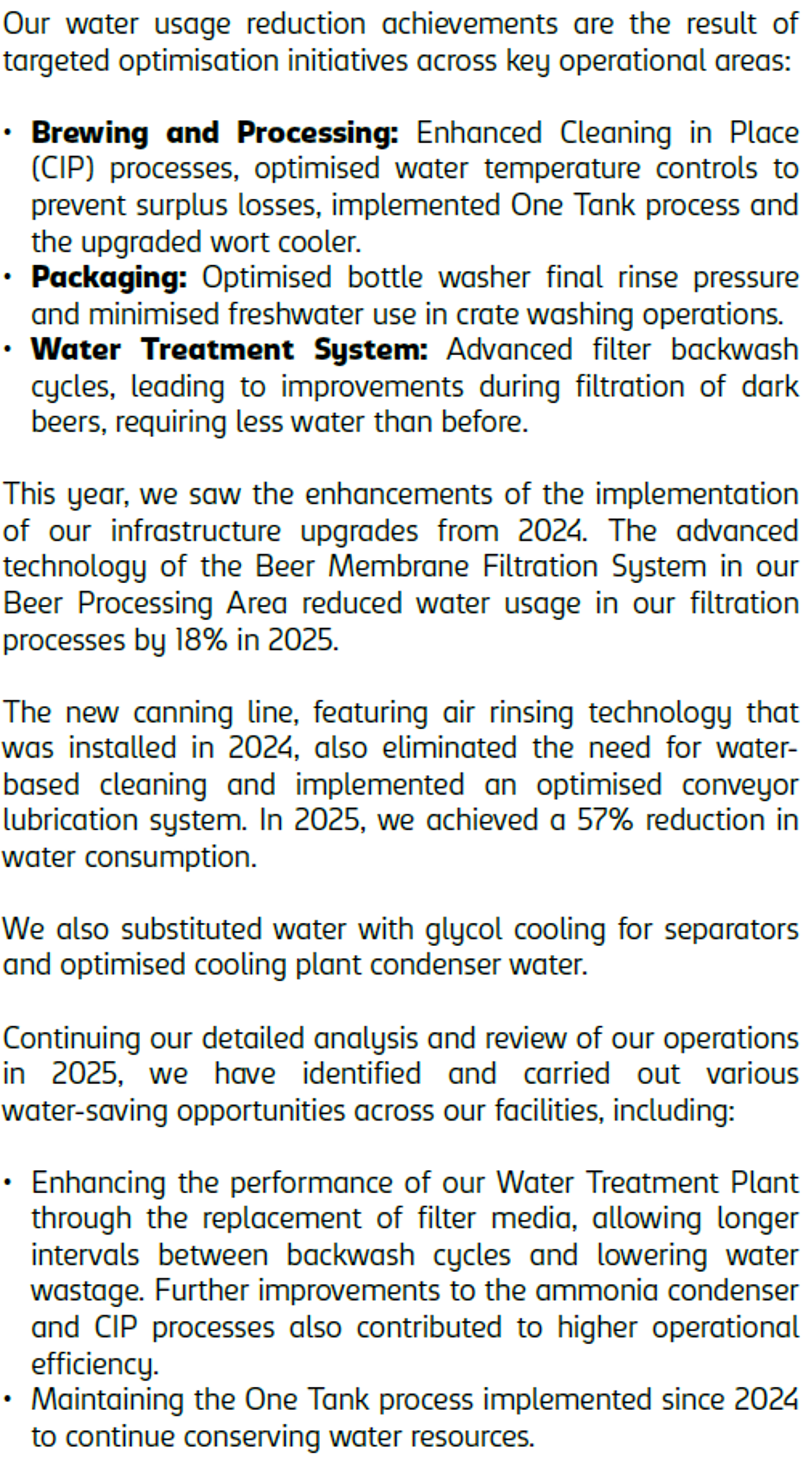 Additionally, bottle washer optimisations at the bottling line are reducing water losses, with full refinement scheduled for completion by end of 2026.