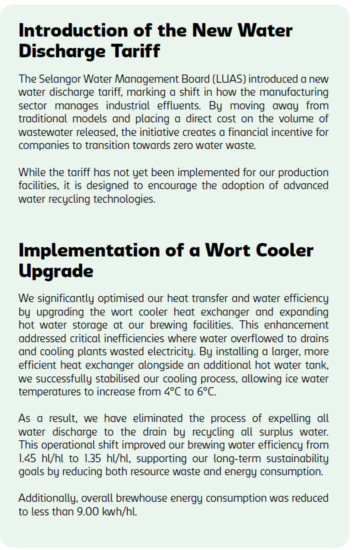 In 2026, our upcoming centralised refrigeration project will drive water optimisation by utilising consolidated condensers to minimise waste. Furthermore, our newly installed wort cooler is already improving water efficiency within the brewing process. While the full impact of this 1.5-year initiative will be realised in the subsequent years, it reinforces our path towards our 2030 target of 2.0hl/hl.